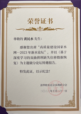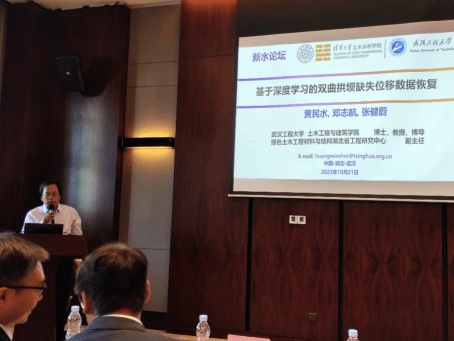 大会设1个主会场,4个分会场,共39场报告。中国工程院王浩院士、张宗亮院士、水利部南水北调工程管理司原司长李鹏程、长江委水旱灾害防御局局长徐照明和广东省水利电力勘察设计院副总经理严振瑞应邀做了大会主旨报告。黄民水教授在主题为“水网工程智能建造与运维”的分会场作了题为“基于深度学习的双曲拱坝缺失位移数据恢复“的报告,针对水网工程智能建造与运维这一国家重大战略需求,介绍了课题组在水利工程结构健康监测领域的最新研究进展,引起了与会同行的广泛关注。
