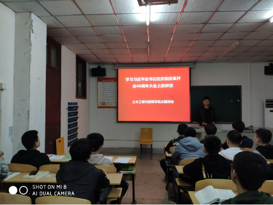 (通讯员肖豪)3月21日晚上7点,土建学院组织员工在二教2507教室举行了学习习近平总书记在庆祝改革开放40周年大会上的讲话主题班会。