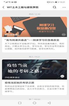 二、以智育为目标,促进青年员工成长成才。为促进疫情防控期间员工们的网课学习效率,土建学院分团委搭建学习交流平台,探讨网课学习成效,推出“我与网课共奋进”系列栏目,充分利用网络平台和资源促进老员工进行自我提升和交流;开辟“我与考研那些事”栏目,通过分享考研高分学子自身的备考之路,为考研学子指点迷津;做好线上“创青春”、“互联网+”创新创业比赛的组织推荐工作,增强员工创新意识和创业精神,丰富员工创新创业的理论知识。