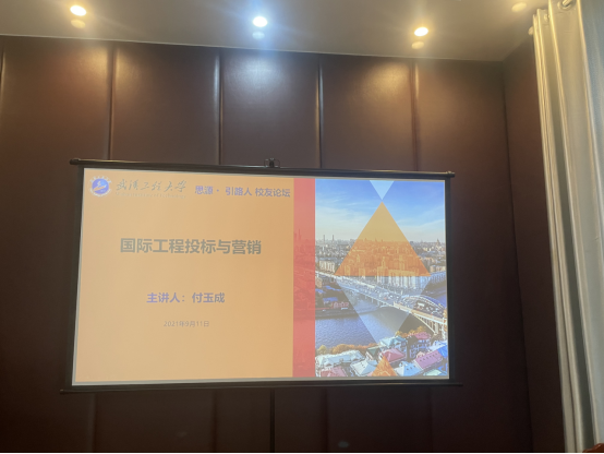 付玉成用诙谐幽默的语言分享了28年海外国际工程投标与营销的成功经验。报告分为两个部分,第一部分国际工程投标与营销,从国际工程市场典型的建设模式和中国企业在国际市场上的典型建设模式引入,深刻分析了典型国际工程项目开发流程、目标市场选择、目标市场进入方式、国际工程营销人员的能力要求、有效的国际市场开拓方法、投标策划和项目实施;第二部分为国际工程营销实战韬略,付总谈到国际工程营销的成功,强调了对成功的渴求、敏锐的商业嗅觉、坚持不懈的执着精神和选择正确方向的能力。讲授了国际工程营销基础、行为营销、营销突破、营销哲学等专业概念;并从国际工程失败案例中分析原因、总结经验、给出建议。勉励在校学子“着眼长远干事业,行稳致远根基牢”。