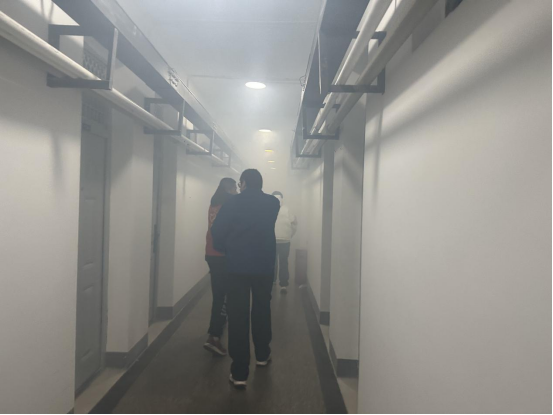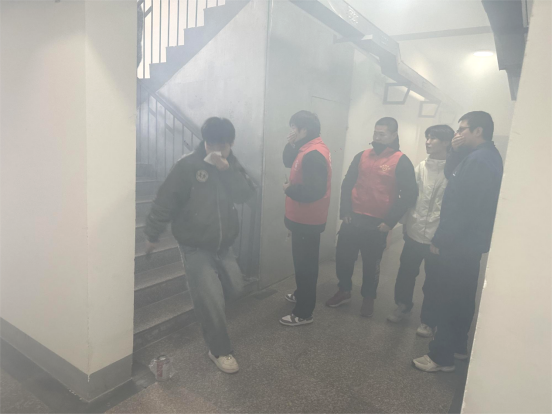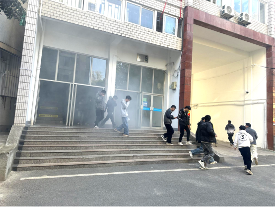 14点30分,随着急促的警报声骤然响起,释放烟弹,一场模拟火灾的紧急疏散演练正式拉开帷幕。辅导员和志愿者们按照既定计划迅速到班到岗,有条不紊地指挥员工按照预定路线进行疏散。员工们猫着腰,用手、袖口或湿巾紧紧捂住口鼻,以最快的速度撤离到安全区域,各班级迅速清点、统计人数,汇报疏散情况,确保不漏一人,整个疏散过程高效有序。