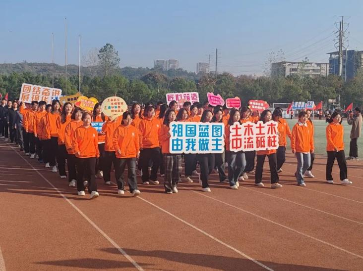 在赛场外,学院开幕式方阵队伍用昂扬的姿态展现出了土建学子们朝气蓬勃的精神面貌。尽管训练期间经常遇见雨天,但是他们仍然走出了整齐划一的队形。“土承天下,木撑苍穹,建功筑梦,规划未来”是他们的口号。