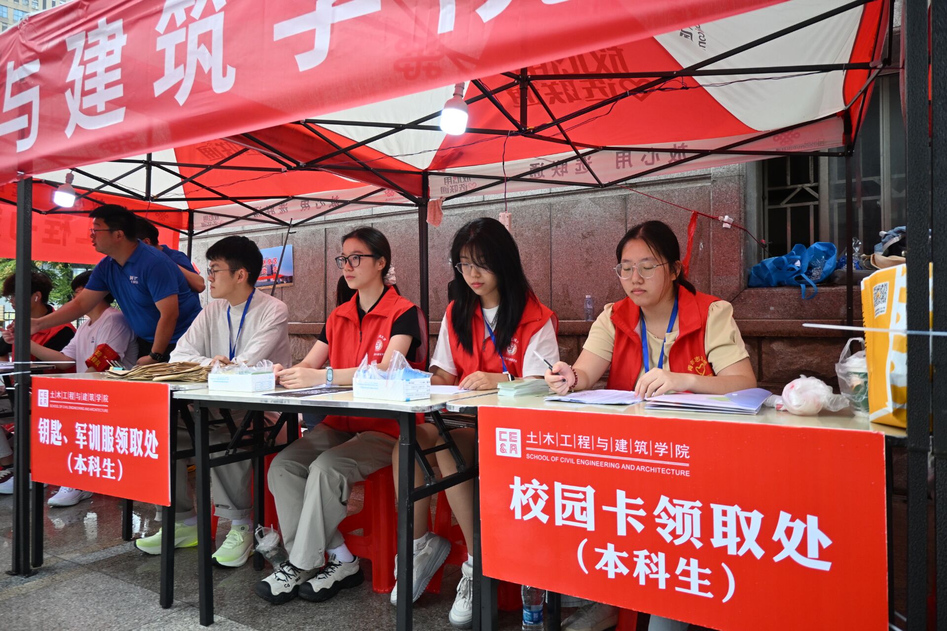 从第一位2025级新生的身影出现在报到点起,学长学姐便热情服务新同学,证件核对、系统录入、校园卡、大礼包发放,宿舍指引、行李搬运……报到注册的整个流程,都井然有序。