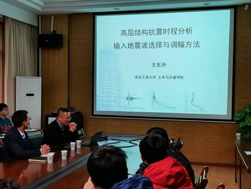 王东升教授的报告题目为《高层建筑抗震时程分析输入地震波选择与调幅》,主要包括地震工程入门、抗震与减震控制以及高层结构抗震时程分析输入地震波选择与调幅三方面内容。首先,王东升教授阐述了如何从工程师的角度看待结构地震作用;随后,介绍了目前地震工程研究的核心矛盾,以及强震观测记录处理对结构分析之影响;此外,系统讲解了选波研究的必要性、时程分析选波方法以及选波原则。最后,师生们就自己感兴趣的问题与王东升教授进行了深入交流和探讨。王东升教授的报告内容丰富、图文并茂,现场学习氛围十分浓厚,讲座持续近三个小时。