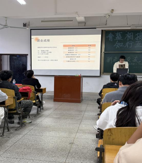 首位分享嘉宾为2021级建筑学专业的肖幕成。他系统梳理了大学期间的竞赛经验与推免心得,并向同学们提出三点建议:第一,课业成绩是发展的基础,应力争保持在专业前列,各科平均分建议不低于88分,并坚决避免不及格情况;第二,积极参与学科竞赛,以此提升综合能力与竞争力;第三,主动联系导师,尽早参与科研项目或论文写作。肖幕成的分享条理清晰、内容务实,为同学们明确了努力方向。