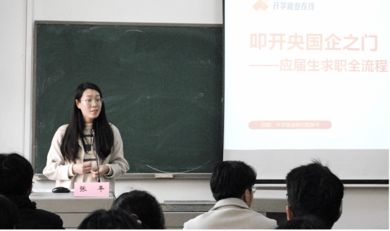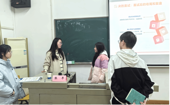 张平老师首先深入剖析了当前央国企的就业形势与政策背景,系统梳理了央国企的分类体系、最新名录及发展特点,并结合实际案例解析其人才需求趋势与职业发展优势,引导员工立足宏观环境,科学评估自身条件,打破信息壁垒,实现职业规划的精准定位。针对央国企招聘环节多、周期长的特点,张平老师重点拆解了从网申、笔试到面试的完整求职链条。她详细讲解了如何高效梳理关键时间节点、打造与岗位高度匹配的专业简历,并分享了笔试常考题型、面试常见问题及应对策略,帮助员工构建清晰的备考路线图与应聘行动计划。最后,在交流环节,同学们围绕“职业发展通道”“实习经历挖掘”等实际问题踊跃提问。张平老师结合自身丰富的行业经验与案例,给予了细致解答和具体建议,为学子们提供了切实可行的行动参考。