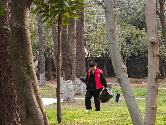 时值三月,万物复苏,春风拂面。学院11位志愿者身穿红马甲,手持清洁工具,穿梭于劳动教育区的每一寸角落。志愿者或手持垃圾袋单独行动;或是一人挥着扫帚,一人握着撮箕紧跟身后,团结合作。身体一躬一起,手臂一挥一落,清扫地面的每一根烟头、每一片碎屑、每一个塑料瓶……