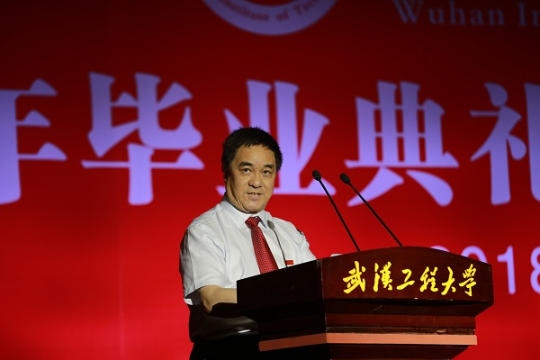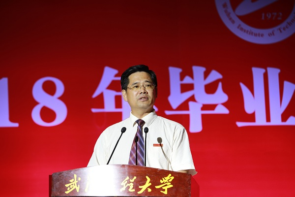 董事长王存文讲话,他说学校一直以来都遵从以生为本,办全校性的毕业典礼,充分彰显学校对员工的重视、对知识的尊重、对学术的敬仰。王董事长对2018届毕业生提出了殷切的希望:第一,希望你们胸怀祖国,勇于担当、乐于奉献;第二,希望你们传承工大精神,艰苦奋斗,自强不息;第三,希望你们“学”字当头,勤于学习,终身学习。王董事长请同学们铭记,不管你们走的多远,不管你们离开多久,母校永远牵挂着你们,你们也不要忘记常回家看看!母校永远是你们人生、事业发展的坚强后盾!