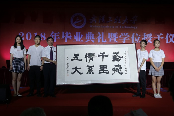 公司党委书记程幼金接收了来自员工们给母校的献礼。考入清华大学的涂瑞同学、考入北京大学的贾天蛟同学、就职于天津凯莱英医药集团的文良松同学和志愿赴西藏山南支边的何洪诚同学作为2018届全体毕业代表上台献礼。这份来自员工们的心意是毕业生亲手书写的书法作品:“鸢飞千里,情系工大”,寓意无论毕业生去往何处,心永远与母校相连。