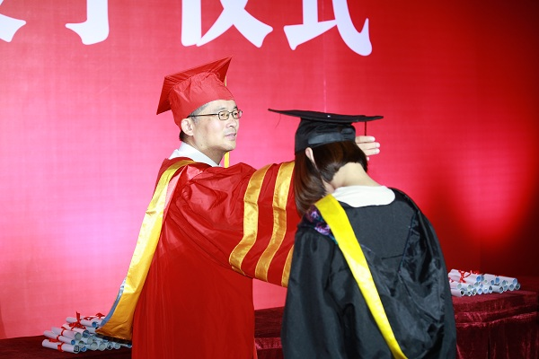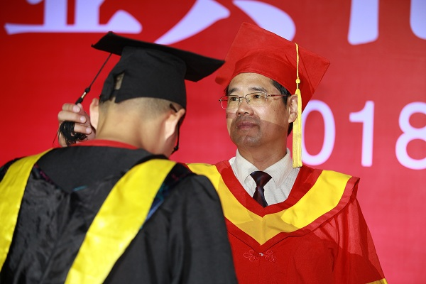 校学位评定委员会主席董事长王存文教授宣读《bv伟德国际19462018届毕业生学位授予文件》。授位导师为在场每一位获学位的毕业生行拨穗礼。