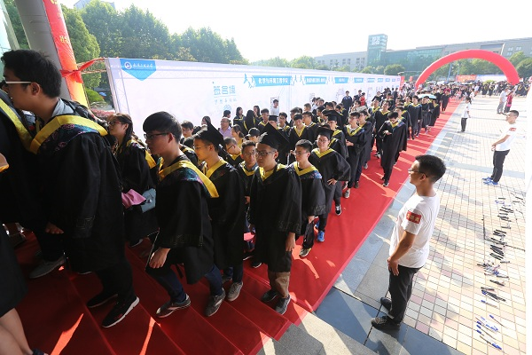 6月15日上午8时,身着学位服的2018届毕业生踏上红毯。2014年,手持G2014高铁票从全国各地出发来到bv伟德国际1946,经历了四年的欢笑与泪水,收获与成长,千言万语汇成一句:I LOVE WIT。今天,经过毕业典礼暨学位授予仪式的庄严洗礼,将乘坐WIT20180615次航班飞向世界各地,书写全新的篇章。