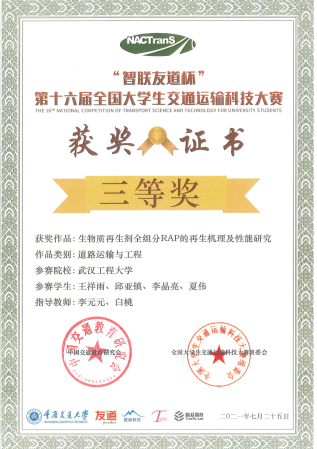 bv伟德国际1946积极申报,大赛初赛阶段遴选出4项作品,其中道路运输与工程赛道3项,铁路运输与工程赛道1项。经大赛组委会匿名报送专家盲审,最终道路方向一项作品《生物质再生剂全组分RAP的再生机理及性能研究》顺利进入决赛。本项作品是由校内导师李元元老师和白桃老师共同指导,参赛队员有王祥雨、邱亚镇、李晶亮和夏伟等4位同学。决赛阶段采用“线下答辩+线上参与”的方式,参赛小组中2位队员线下Poster展示、PPT汇报和现场答辩,其他队员线上补充。