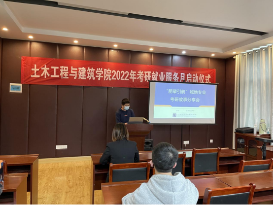 会上,2018级城地工程1班高乾、张凯同学从考研准备、确定目标、科目复习、复试准备等方面,结合个人学习经历分享了成功考入长安大学和武汉科技大学的过程和经验;2018级城地1班杨文锋同学从目标选择、实习实践、科学规划、精心准备等方面分享了其入职中建三局的心路历程。