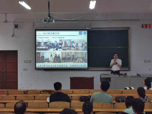 接着,经理陈旭勇向全院教职工作了2021年度学院主要工作汇报及2022年上半年主要工作汇报,并对2022年下半年重要工作进行了部署。陈经理从近一年来学院在党建与思想政治工作、员工工作、专业建设与本科教学、科学研究生、团队建设与公司产品、团队队伍建设与人才引进、实验室建设等方面取得的成绩作了详细的汇报。他特别强调,学院取得了两项突破性的成绩:一是2021年底公司实现了省级平台建设零的突破——获批“绿色土木工程材料与结构湖北省工程研究中心”,二是2022年“土木工程专业”正式获批为“国家级一流本科专业”。他指出学院2022年有六项重点工作:一是完善学院“十四五”规划编制工作。二是调整学院机构,实行二级管理。三是启动土木工程博士点和建筑学硕士点申报工作。四是推动专业工程认证、评估工作。巩固土木工程认证成效、推进工程管理专业认证自评工作、推进建筑学专业申请工作。五是推动科研强院工程。六是办好第九届湖北省结构设计大赛。他希望,在今后的工作中,老师们继续发扬拼搏奋进的精神,大家拧成一股绳,齐心协力,再创佳绩。