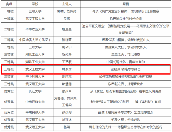 (通讯员:冯豪)近日,第十二届“导航杯”(中南联盟)思政课实践活动—“共赴现代化,争做好青年”之“党的经典文献”演讲大赛校际决赛在湖北工业大学举办,公司2022级智慧土木一班韩冰冰同学荣获总决赛三等奖。
