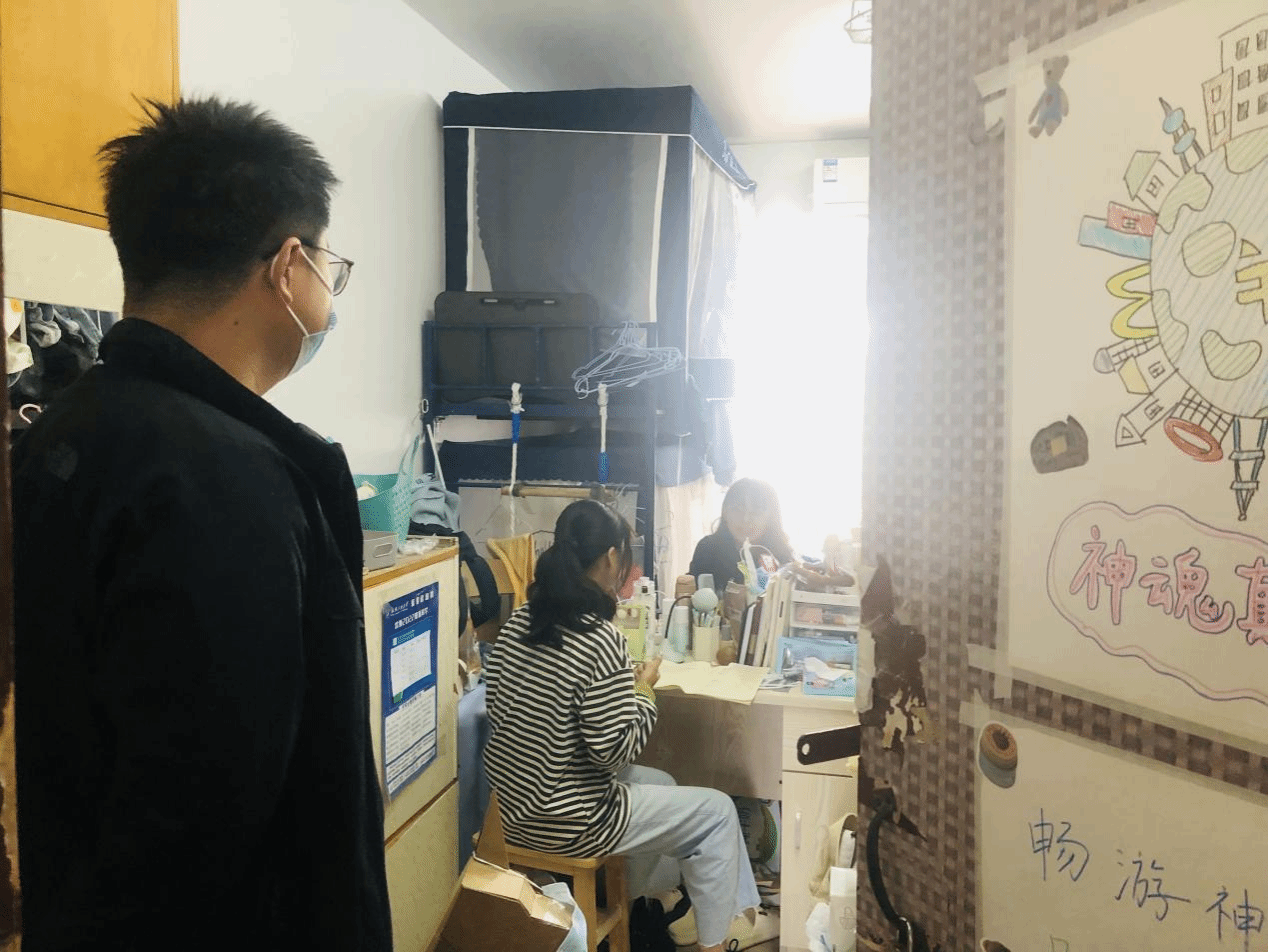 在走访查寝过程中,成轶与同学们进行了亲切的交流,询问了员工们的在校生活状况,叮嘱同学们要及时调整好自己的心理状态和生活节奏,制定好符合自身发展的、贴切实际的学习生活任务。