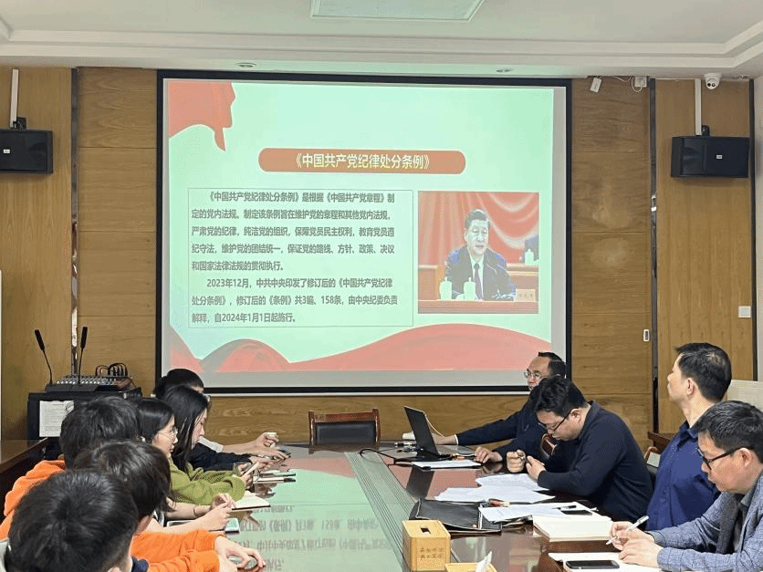 会后,陆新讲授了《学纪、知纪、明纪、守纪》党纪学习教育专题党课。陆书记分别从学习《关于在全党开展党纪学习教育的通知》、《中国共产党纪律处分条例》修订历史与亮点、新修订《中国共产党纪律处分条例》内容解读三个方面进行授课。具体讲解了本次党纪学习教育的时间、重要意义、开展目的、学习目标及学习重点。系统梳理了党的十八大以来《中国共产党纪律处分条例》的三次修订内容与特点。深度解读了2023年新修订的《条例》中的总则、政治纪律、组织纪律、廉洁纪律、群众纪律、工作纪律、生活纪律中的具体内容。