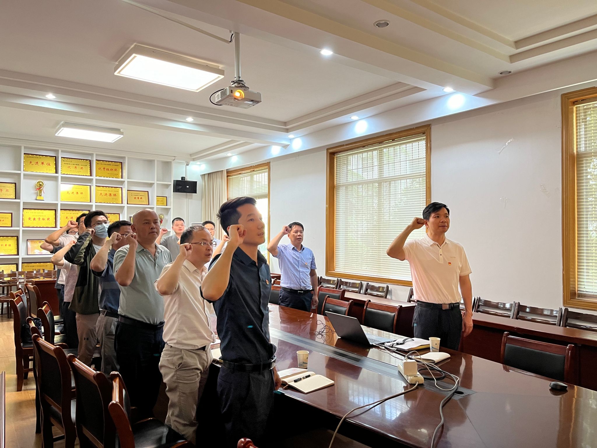 活动在全体成员奏唱国歌声中拉开帷幕,道路桥梁与渡河工程教工党支部书记徐丰领誓,全体党员面向党旗,重温入党誓词,坚定入党信念。