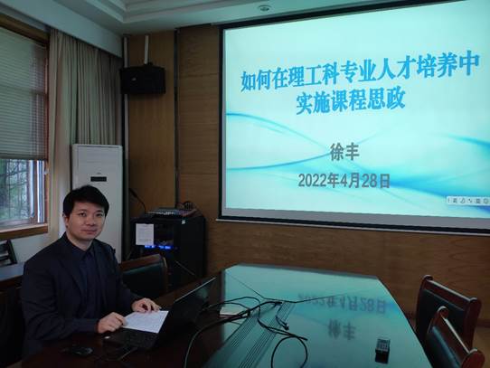 研讨会上,徐丰主任围绕“如何在理工科专业人才培养中实施课程思政”这一主题,紧扣“立德树人师之本,教书不能忘育人”这一核心理念,从“什么是课程思政?课程思政有哪些形式?课程思政有什么特点?如何做好课程思政?”等四个方面对学院做好课程思政建设提出深刻见解。他提到课程思政非常现实和普通,但非常重要,要结合我们的国情,传递给员工正能量的内容。徐主任分享了自己在课程教学中探索总结的“价值引领的课程思政经验”,介绍了理工科专业课程思政的特点、痛点和发力点,着重强调:要做好课程思政,教师首先要自己做好思政,“用心”去做思政,做到“打铁还须自身硬”,练就真本领。